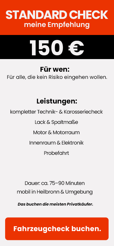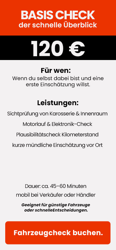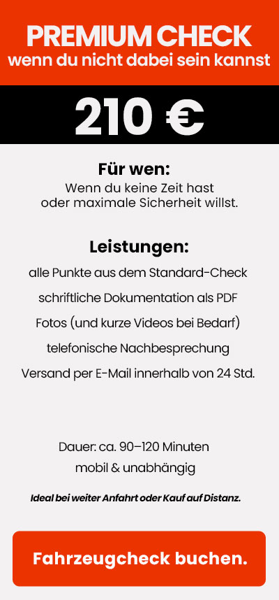 Unser Fahrzeugcheck bietet eine umfassende Überprüfung von Fahrzeugen aller Klassen, wobei die spezifischen Prüfungsinhalte je nach Fahrzeugklasse individuell angepasst sind. Von den Fahrzeugdokumenten über die Fahrzeughistorie bis hin zum Lack, Motor, Elektronik, Kilometerstand und Innenraum - wir decken alle wichtigen Aspekte ab, um Ihnen ein detailliertes Bild Ihres Fahrzeugs zu liefern. Erfahren Sie mehr über die Prüfungsinhalte während des Buchungsprozesses oder auf unserer Produktseite. Vereinbaren Sie noch heute einen Fahrzeugcheck, um sicherzustellen, dass Ihr Fahrzeug in bestem Zustand ist.